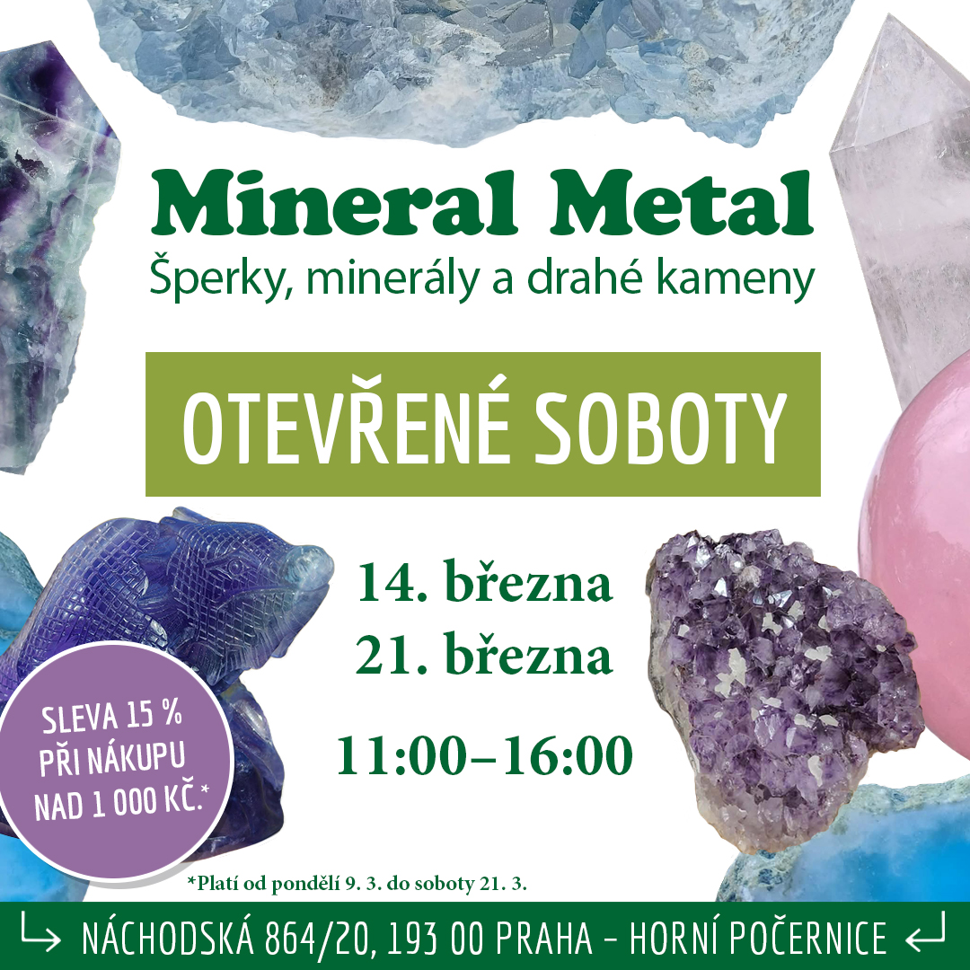 Právě probíhá slevová akce, od pondělí 9. 3. až do soboty 21. 3. Sleva 15 % bude poskytována na nákup nad 1 000 Kč (nevztahuje se na knížky, karty, kožené řemínky, obalový materiál, lahvičky se zlatem, bubínky štěstí, vitrínu s meteority a dřevěné figurky).